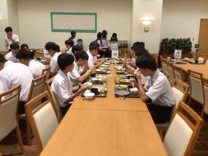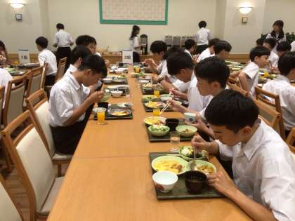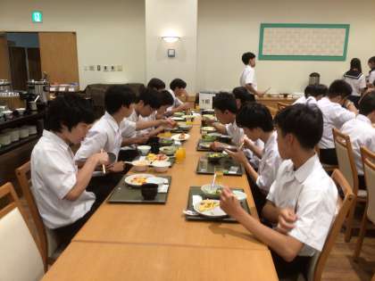修学旅行最終日です。みんな部屋チェックの合格をもらって、元気に朝食をいただいています。