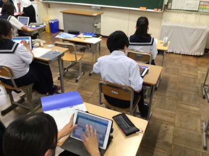 2年生は、総合の時間に、職場体験学習のまとめをしていました。タブレットを使用し、「シンプルプレゼン」でまとめています。まとめができたら、1年生に向けて発表です。
