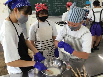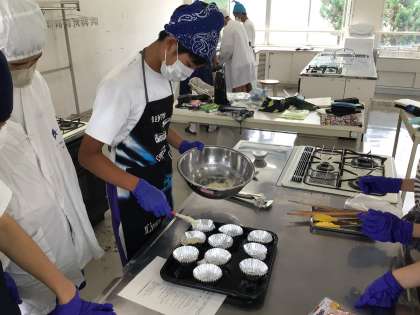 家庭科で、調理実習をしていました。ホットケーキミックスを使い、簡単カップケーキ作りでした。みんなで協力して、楽しく作っていました。私も食べさせてもらいましたが、とてもおいしかったです。ありがとう!