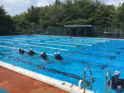 体育の授業では、水泳の授業を行っています。プールに入っている生徒は、とても気持ちよさそうに泳いでいました。なお、見学者は、プールサイドの気温が高いため、別室(エアコンあり)で、見学者用の学習をしています。