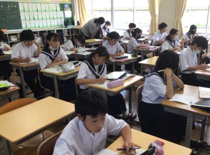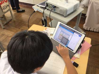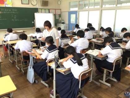 1年2組は、英語の授業で、「自己紹介スピーチを考えよう!」を学習目標に、それぞれの生徒が、自己紹介を考えていました。タブレットを活用し、みんな真剣に考えていました。