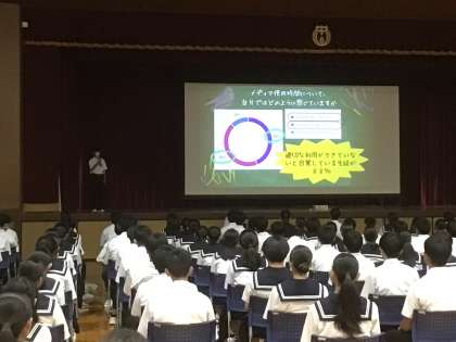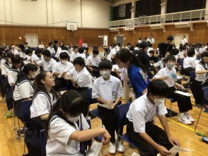 今日は、みんな健康宣言をしました。メディアの使い方について、家庭でのルールがないと答えている生徒も多いです。夏休みは目前です。今回生徒たちが考えた健康宣言をもとに、ご家庭でも話題にし、ルールを考えてみてください。