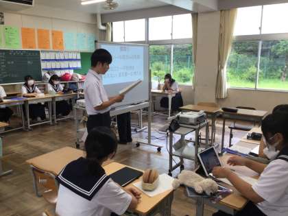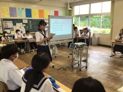 2年生は、総合の時間に、後日行われる「1年生への職場体験の報告会」のリハーサルを行っていました。プレゼン資料を使って、とても分かりやすく説明していました。1年生にも皆さんの思いがしっかりと伝わると思います。ぜひ、先輩として本番も頑張ってください。