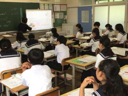 1年1組は、英語の授業で、テストの解説を行っていました。前方のホワイトボードに解答を映し出しての説明はとても分かりやすいです。
