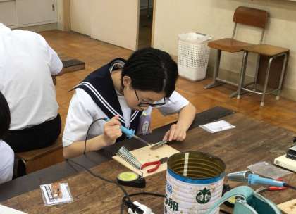 2年1組は、技術の授業で、「はんだづけ」の練習をしていました。とても集中して行っていました。