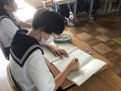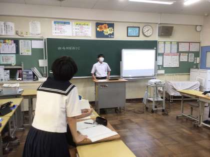 2年生が、6月の職場体験学習で学んだことを、学習用タブレットの発表ノートを駆使してまとめ、1年生に発表しています。みんな、とても上手にプレゼンテーションしていてすはらしいです。1年生は、2年生の発表をメモを取りながら聴き、発表後に疑問に思ったことを質問していました。積極的な姿勢がすばらしいです。