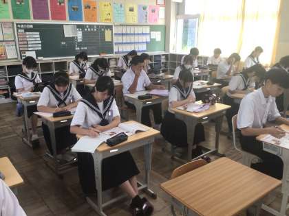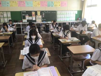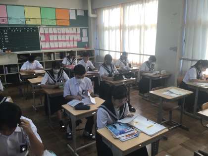 本日は、期末テスト2日目です。テスト期間中は、朝の読書の時間をテスト勉強の時間としています。1問でも多く問題が解けるよう、みんな直前まで、学習に取り組んでいます。