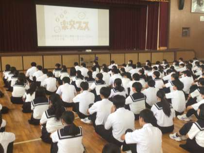 今日は、生徒会主催の「楽交フェス」がありました。これは、生徒会執行部が企画した会で、全校生徒が1〜3年生の縦割り班に分かれてゲームを行う企画です。目的は、ゲームを楽しみながら、今まであまり関わったことがない子と学年関係なく交流を深めることです。ゲーム内容は、「わなげ」「ボトルフリップ」「ボール投げ」「スリッパ飛ばし」「千本引き」「射的」でした。