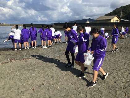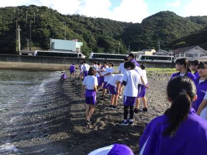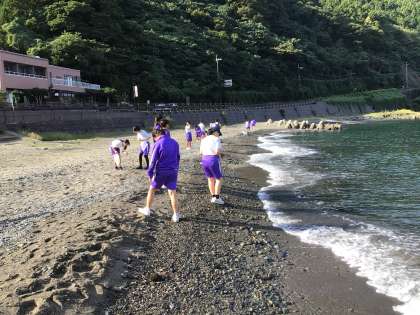2日目の朝です。みんなの集合がとても早く、少し時間ができたので、海岸で自由時間です。今日もみんな元気です。