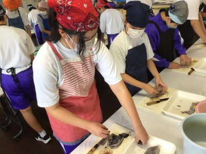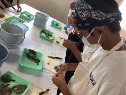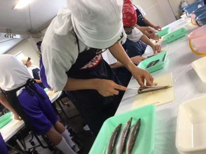 魚さばき体験をしています。刺身班、焼き魚班、汁物班に分かれて活動しています。