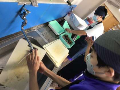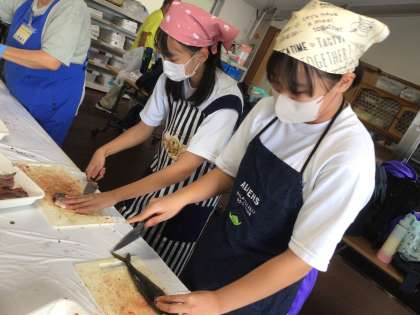 魚を3枚におろしたり、汁物に入れる玉ねぎを切ったりしています。手際よく片付けもしています。