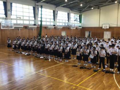 10/6 全校合唱練習 公開日 2025/10/06 更新日 2025/10/06 学校行事 今日の藤中タイムに、全校合唱(翼をください)の練習をしました。今までは、パートに分かれたり、縦割りで行ったりしていましたが、初めて全校が集まって練習しました。 全校で集まるとやはり迫力があります。しかし、まだまだ上手になると思います。3年生を中心に、全校生徒の心を一つにして、見ている方々に感動を届けられる歌にしていきましょう。