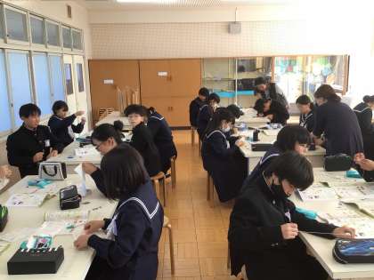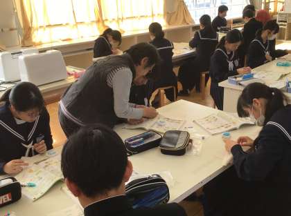 今日も家庭科の裁縫の授業で、ボランティアの方に来ていただき、縫い方を教えてもらいました。とても丁寧に教えていただけるので、ありがたいです。今後も地域の方々とともに、藤中生を育てていきたいと思います。