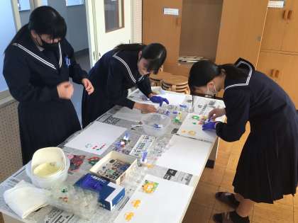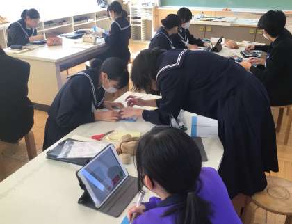 家庭科の時間に、絵本作りをしています。ステンシルを使用し、絵を書き上げるなど、それぞれに工夫して仕上げていきます。小さい子が喜ぶようなかわいらしい作品を作ってください。