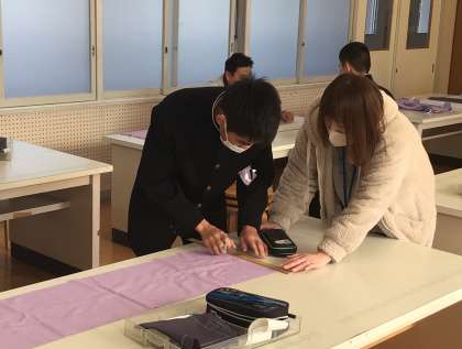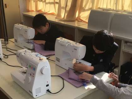 1・2学級は、家庭科の授業で、「きんちゃく袋とランチマット」を製作していました。みんなで分担して、協力しながら作業を行っていました。素敵な作品ができあがると思います。