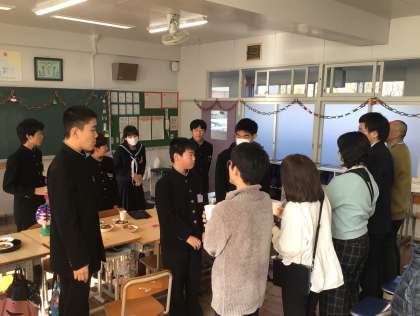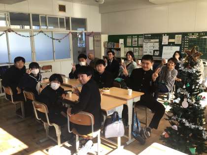 3時間目に、1・2学級では、クリスマス会をしました。みんなでクリスマスの歌を歌ったり、自分たちで作ったクッキーを食べたりしました。先生たちも招待してもらい、楽しい時間を過ごさせてもらいました。