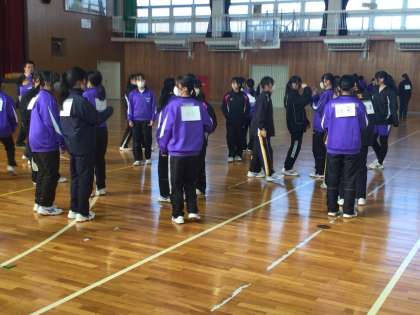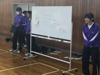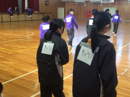 12/22 学年レクリエーション(3年) 公開日 2025/12/22 更新日 2025/12/22 各学年から 3年生が、学年レクリエーションを実施しました。3年生は、リーダー会が考えた「パートナーを探せ」というゲームを行いました。これは、自分の背中につけられたカードと同じカードをつけたパートナーを探すゲームです。みんなに質問しながら楽しくゲームを実施できていました。