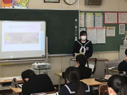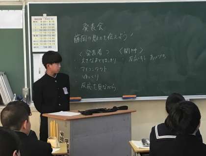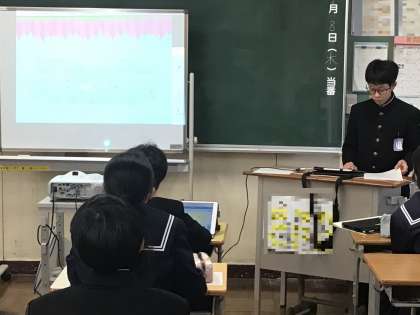 1年生は、これまでそれぞれの生徒が、「藤岡」について、調べたり、質問したりしてきました。本日は、それをまとめたものを学級の生徒の前で発表しました。みんなしっかりと発表していました。また、発表を聞く生徒の姿勢もすばらしかったです。みんなが「藤岡」について、しっかりと理解し、みんなの力で「藤岡」を、さらに素敵な町にしていきましょう。