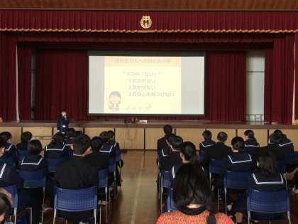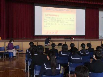 認知症の方との接し方や声のかけ方を教えていただきました。相手が何か失敗した時に責めてしまうと、へこんでしまって、認知症の症状が急激に進むといった内容を聞いて、生徒たちも驚きながら真剣に聞いていました。