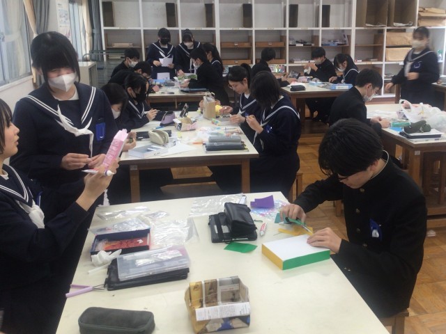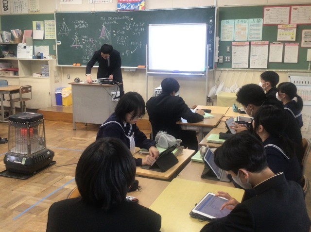 1/29 授業風景(3年) 公開日 2026/01/29 更新日 2026/01/29 各学年から 3年生の4時間目の授業です。1組は、体育の授業で、選択球技を行っていました。バドミントン・卓球など自分が興味のある球技を楽しんでいました。2組は、数学の授業で、三平方の定理を使って立体の側面積と体積を計算していました。3年生にもなると難しい問題に挑戦しています。3組は、美術の授業で、BOXを作成していました。多くの生徒が自分の作品を完成させていました。 +3