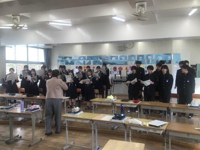 3年2組が音楽の時間に卒業式の歌の練習をしていました。まずは、それぞれのパートに分かれて練習し、最後はクラス全員で合唱をしていました。さすが3年生です。とても素敵な歌声を響かせていました。卒業式まで、あと1か月少々、クラスの仲間、学年の仲間と合唱できる機会が少なくなってきています。卒業式で、3年間の思い込めて歌う歌、きっと素晴らしいものになるでしょう。