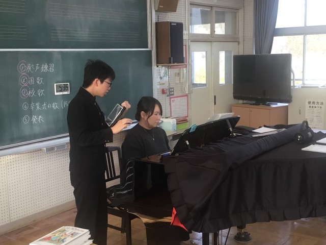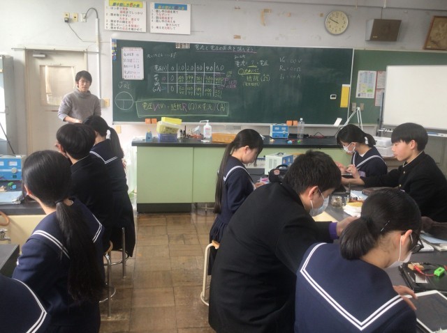 1年生は、家庭科の時間に衣服の手入れ(洗剤の働き)について学習していました。どんな洗剤を使ったらよいかをみんなで考えていました。生活に生かせる学習です。2年生は、理科の時間に電流と電圧の関係について学習していました。どうしたら公式を覚えることができるか分かりやすく説明していました。3年生は、体育の授業で選択球技(サッカー、アルティメット)を行っていました。担任の先生も一緒になって楽しく運動していました。1・2学級は、音楽の授業で卒業式の歌を練習していました。気持ちのこもったきれいな歌声を響かせていました。