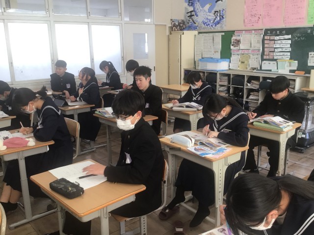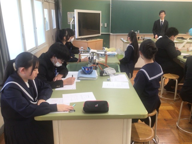 1年生は、体育の授業で「持久走」を行っていました。今日は、ストップウォッチをもって、自分たちで決めた速さを続けていくペース走でした。2年生は、社会の授業で、「富国強兵と文明開化」について学習していました。教科書を読みながら内容を確認していました。3年生は、理科の授業で入試対策を行っていました。先生と一緒に今年の入試で出そうな問題を予想しながらの対策でした。