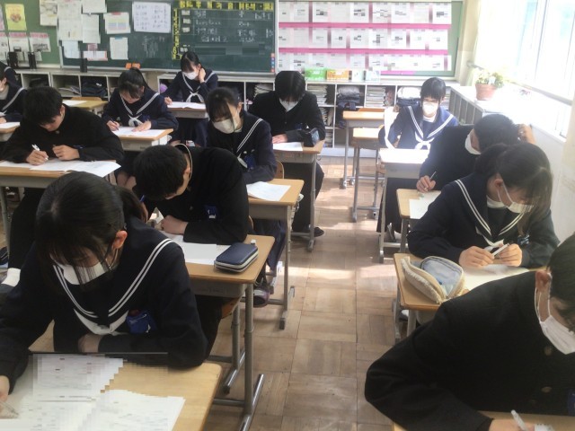 1年生は、技術の時間に実験結果を観察していました。結果を見て驚きの声が上がっていました。2年生は、英語に時間にリーディングを実施していました。教科書を見ながらとても良い発音で読んでいました。3年生は、理科の時間に入試対策を行っていました。明日は、公立高校の一般入試です。自分の力を出し切れるようがんばってください。