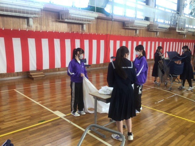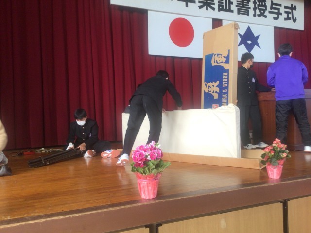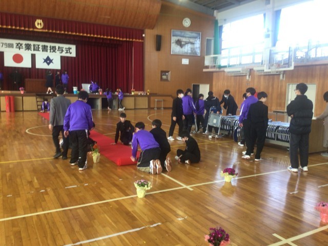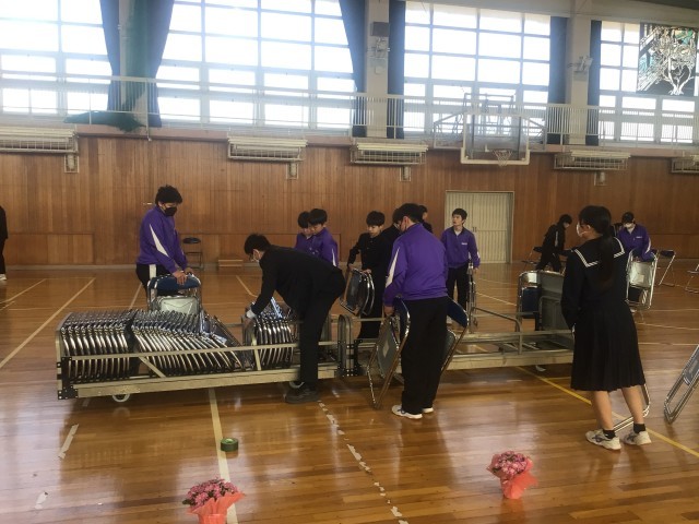 3/9 式場の片づけ 公開日 2026/03/09 更新日 2026/03/09 学校行事 本日朝、2年生の生徒が卒業式の式場の片づけをしました。最上級生としての最初の仕事でしたが、どの生徒も一生懸命取り組んでいました。人のために頑張ることができる姿勢は、藤中の伝統としてしっかりと受け継がれていると感じました。今後も、藤中の顔としていろいろな場面で活躍することを願っています。 +3
