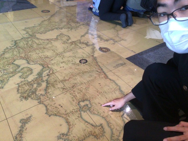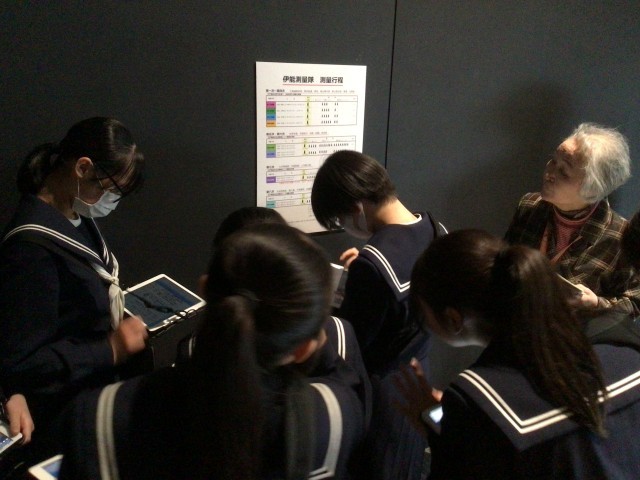 伊能忠敬展を鑑賞しています。探求ワークシートの問題を解こうと隅々まで展示物を見ています。