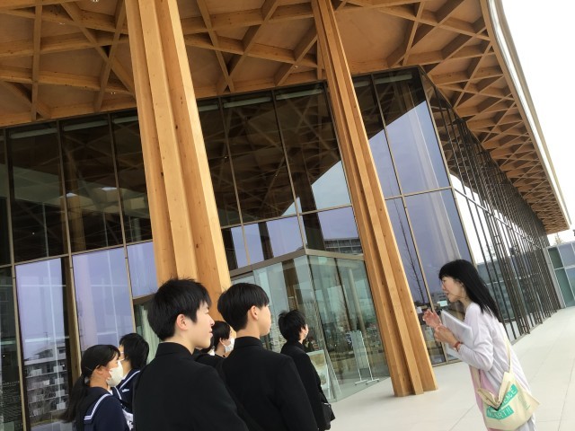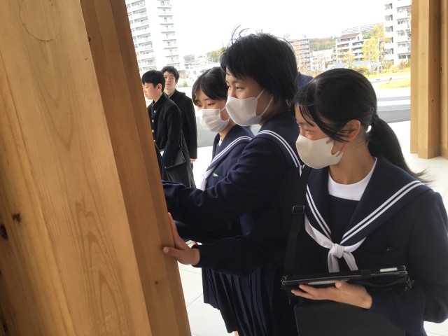 博物館の外観を見て触っています。豊田市の木材が使われています。