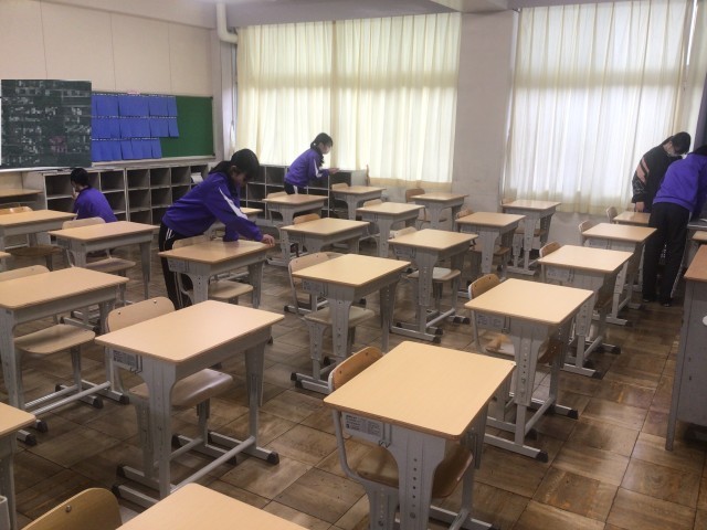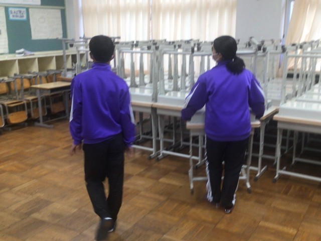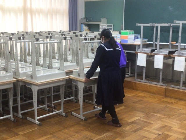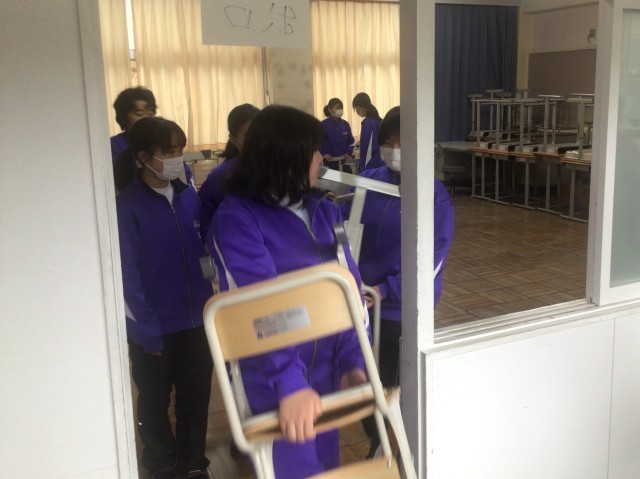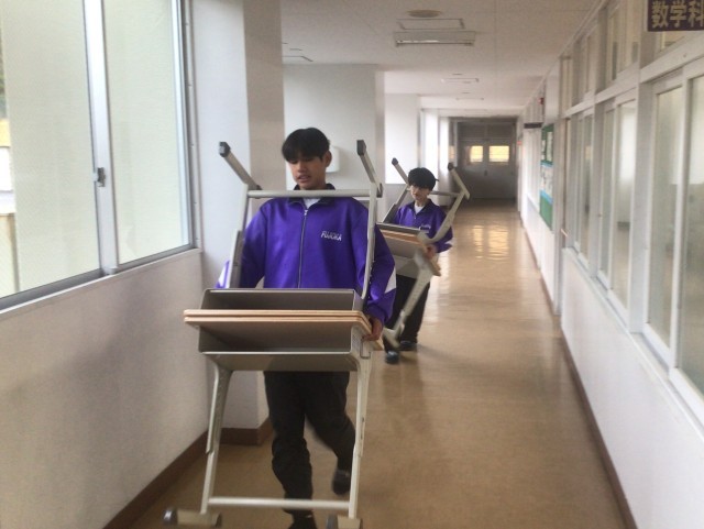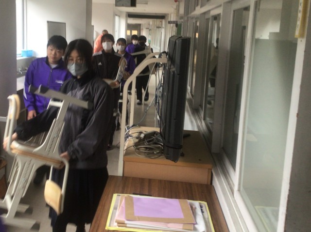 本日朝、各教室に新学習セットを搬入しました。先週ワックスがけをし、きれいになった教室に多くの新しい机といすを入れました。これにより令和8年度は、すべての生徒がきれいな学習セットで授業を受けられることになります。気持ちよく受けらますね。