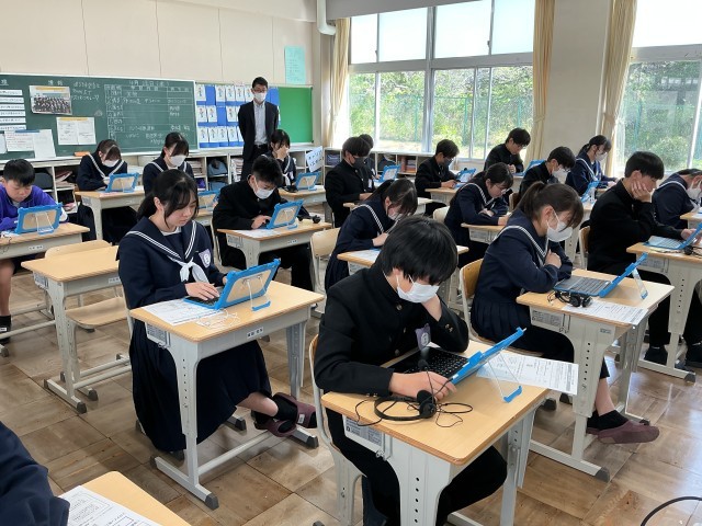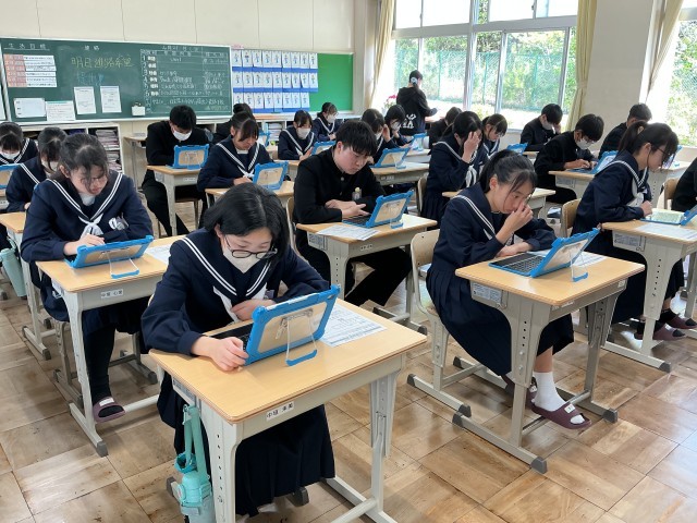 本日の午後、3年生が全国学力・学習状況調査の英語(読む・聞く)と質問に取り組んでいます。学習用タブレットで文を読んだり、流れてくる英語を聞いたりしながら、キーボードで答えを入力していました。真剣な眼差しで取り組んでいます。明後日は国語と数学、5月1日には英語(話す)を受けます。3年生、日常生活の中に体育祭や修学旅行に向けた準備がある中、さらにテストも続きますが、とてもよく頑張っています。さすが、藤中の顔です!!