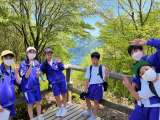 新緑の美しい景色を眺めながら、班でウォークラリーを楽しみました。日差しは強いです...