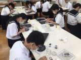 美術の授業で、「うるしの手鏡」を作成しています。卵の殻を細かくしたものを、手鏡に...
