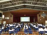 藤中タイムに、体育館で全校集会を行いました。エアコンを使用したため、とても快適...