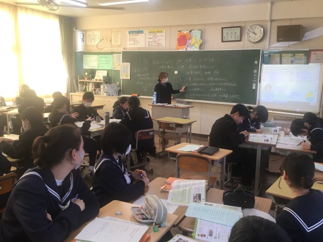 1年生は、数学の時間に学年末テストに向けて、反比例の復習をしていました。グループ...