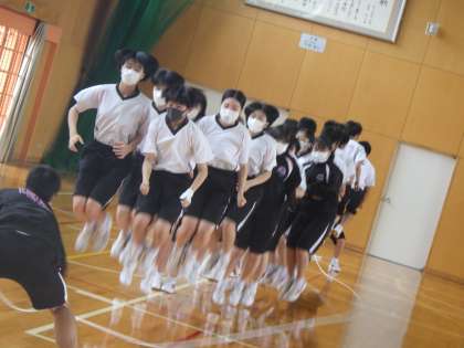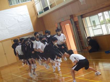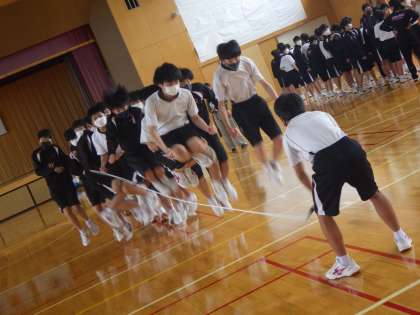 3年生が、体育館で学級長縄跳びを実施しました。新クラスの絆を深めるとともに、きたる5月13日(金)の体育祭をにらんでのチャレンジ。