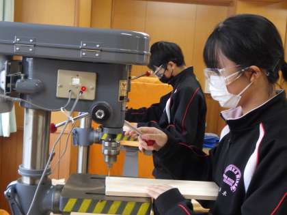 上の写真は技術で、工業機械を使って木材加工をしているところです。