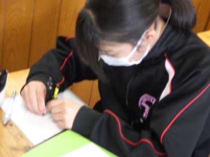 下の写真は美術で、自分がデザインした「紋」を使ったコースターの制作をしているところです。