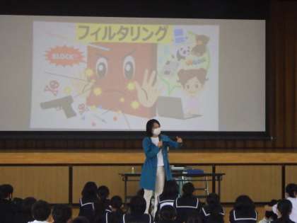 本日、ルミノソの方を講師に迎え、情報モラル教室を開催しました。コロナウイルス感染対策のため、学年ごとに時間をずらし、体育館で実施しました。