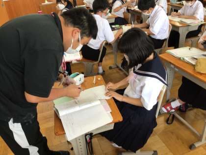 中央の写真は、理科の化学反応の問題に挑戦しているところです。