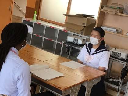 上の写真は、英語の授業でネイティブに自分の趣味を英語で伝えているところです。