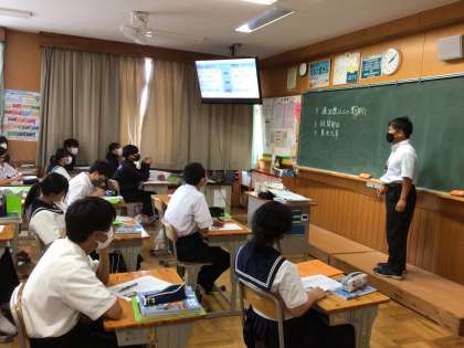上の写真は、社会の授業です。ICT機器でさまざまな資料を提示しています。
