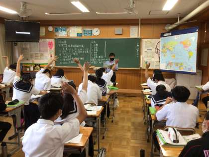 中央の写真は、社会の授業です。積極的に授業参加しようと挙手をしています。