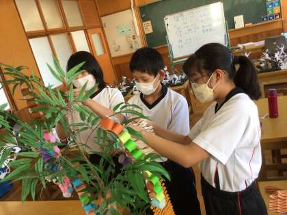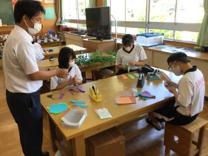折り紙を切り貼りして、それぞれが3種類の飾りを作りました。
