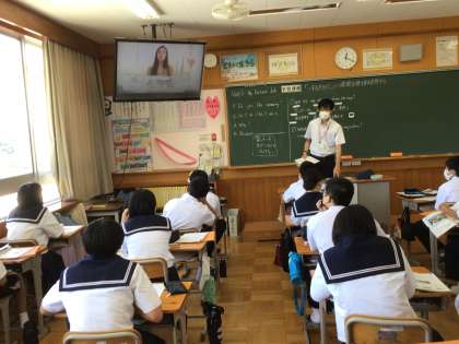 中央の写真は、英語の授業です。ICT機器を駆使して、実際の会話の雰囲気をつかみます。