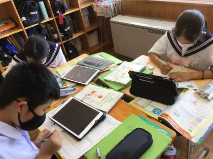 上の写真は、国語の授業です。竹取物語の登場人物の心情について、ペアワークで読みを深めています。