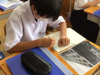 上の写真は、美術の授業です。遠近法を用いた校舎のデッサンを行っています。