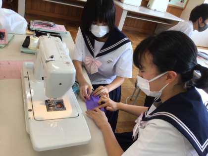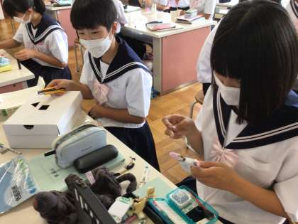 3年生が、家庭科で「幼児が遊べるおもちゃ」を制作しています。